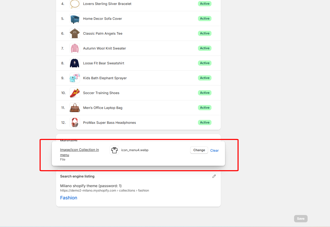 3. Scroll down to the **Custom data** section. You will see your new "Menu Icon" field there.