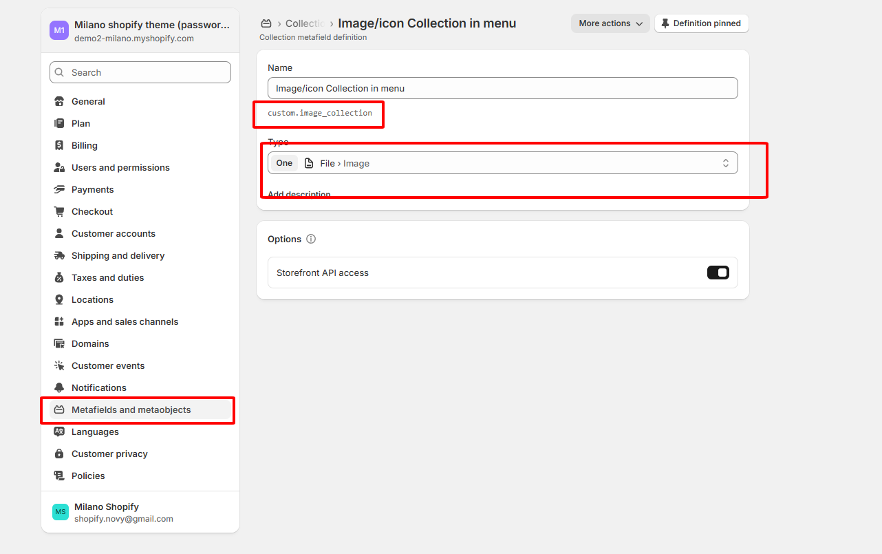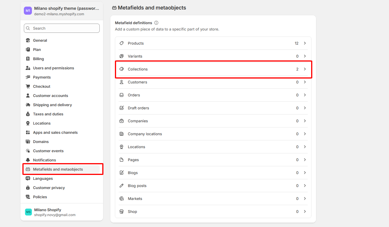 1. Go to **Settings** > **Custom data** in your Shopify Admin.