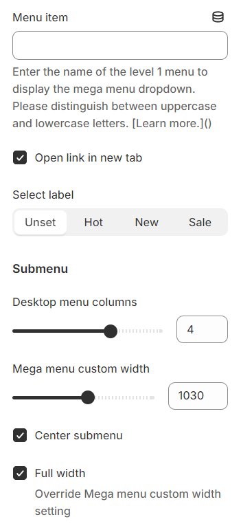 | Submenu   | <p></p><ul><li><strong>Desktop menu columns:</strong> The submenu settings include the option to determine the number of columns for the desktop menu.</li><li><strong>Mega menu custom width:</strong> You can also set a custom width for the mega menu.</li><li><strong>Center submenu:</strong> Align the submenu to the center.</li><li><strong>Full width:</strong> If you select full width, it will override any custom width setting, expanding the menu across the entire screen width.</li></ul> |