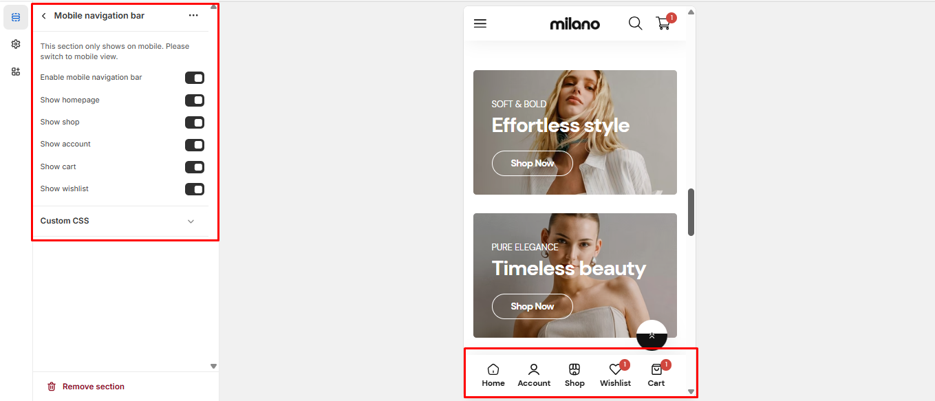 In these settings, you have the option to display any button from the list on the mobile navigation bar.