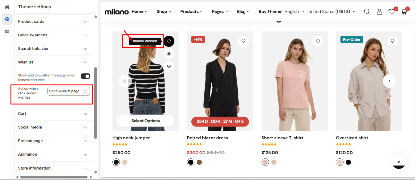 Besides, the **Remove wishlist** option allows them to remove products either by visiting the wishlist page or clicking on the wishlist icon on the product container again.