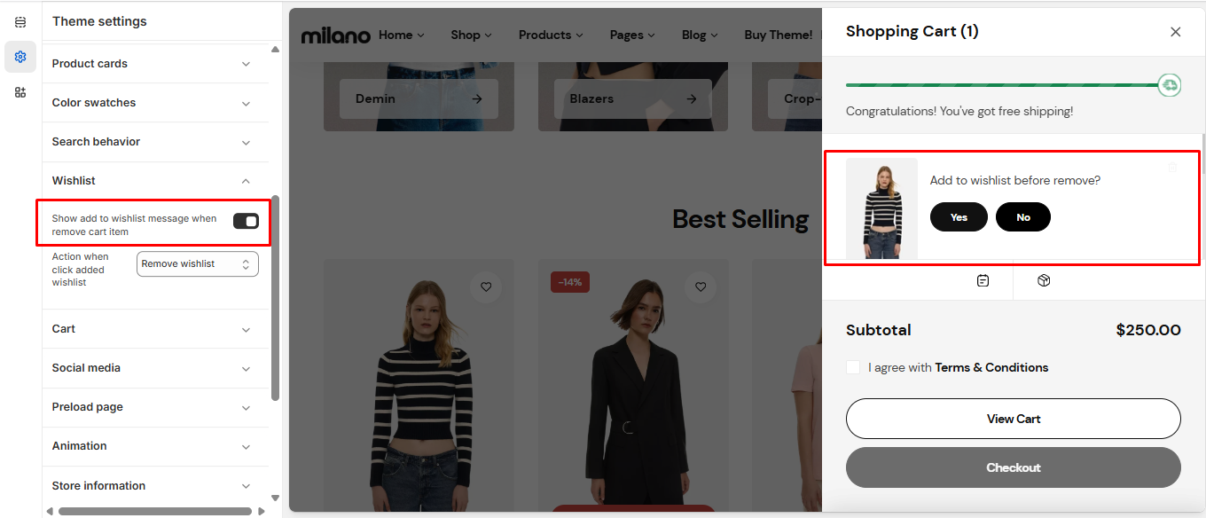 When "**Show add to wishlist message when remove cart item**" is enabled, customers will see a message when they remove a product from their cart.